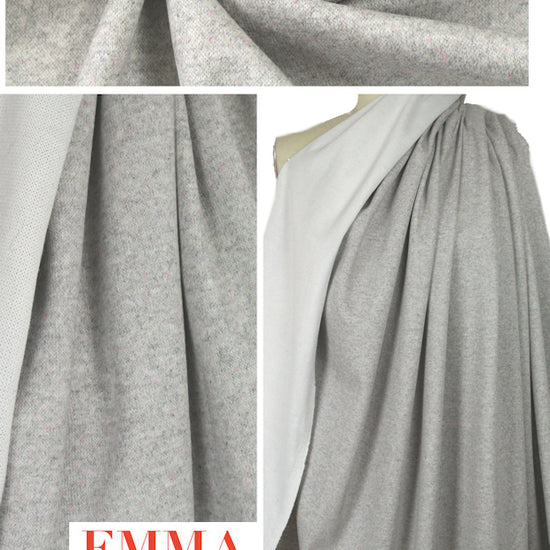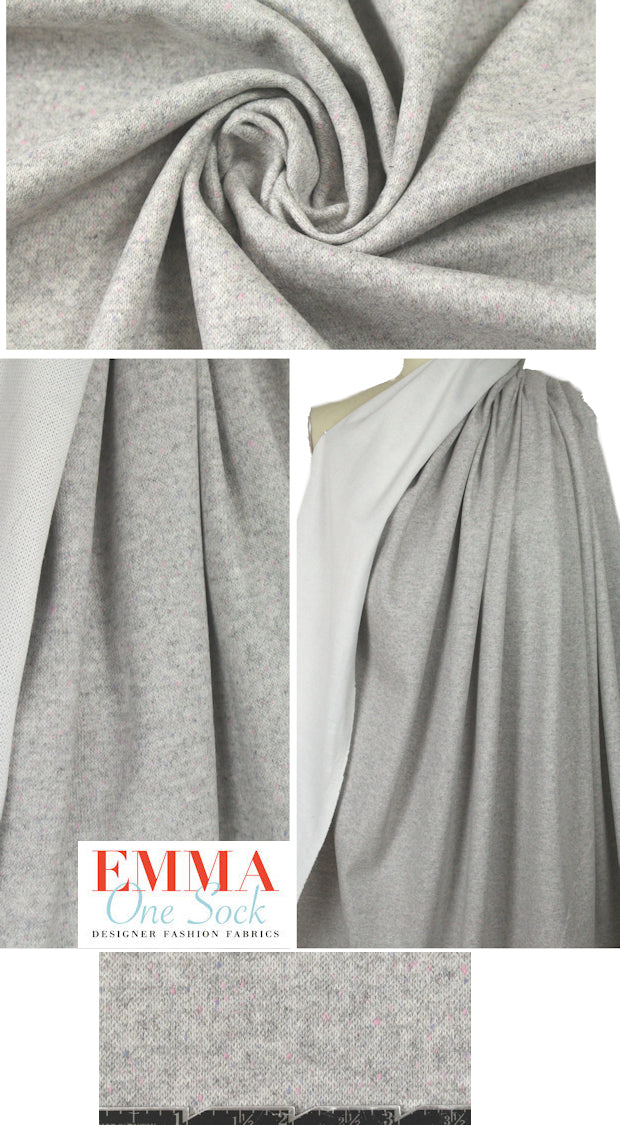 This is a wonderful wool blend sweater knit, with a yarn dyed, speckled face and a smooth white 'wicking' type of knit on the reverse. It is medium weight with body in the drape and about 35% widthwise stretch. The main color on the right side is light stone gray, with pink and lavender-tinted gray flecks (PANTONE 14-4002, 14-2808, 15-4008-ish). This is casual gem that is perfect for upscale hoodies, casual jackets, cardigans, cocoon coat, etc. Manufacturer recommends dry cleaning but you can try hand washing and hanging or lay flat to dry (please test first). LAST PIECE, 1 yard.