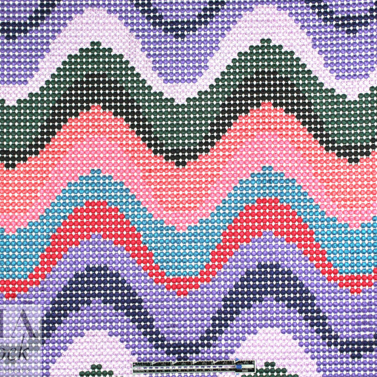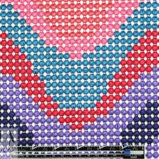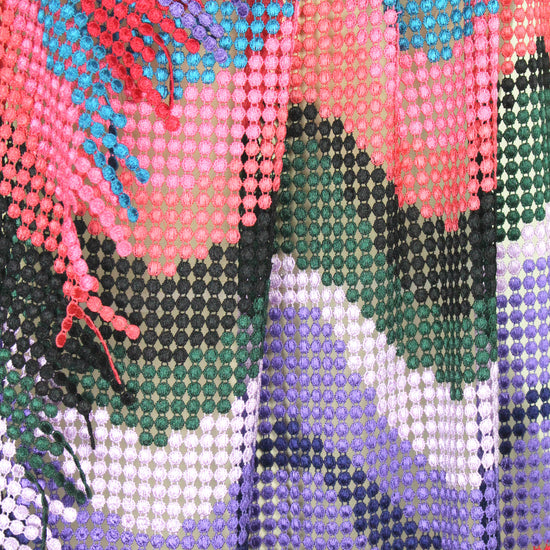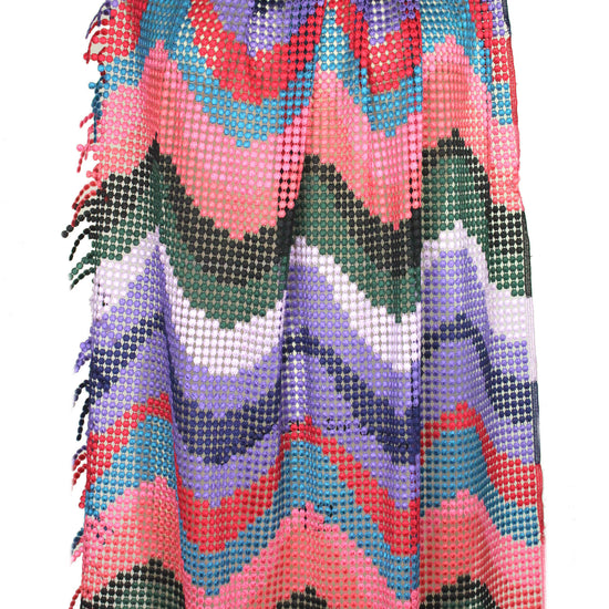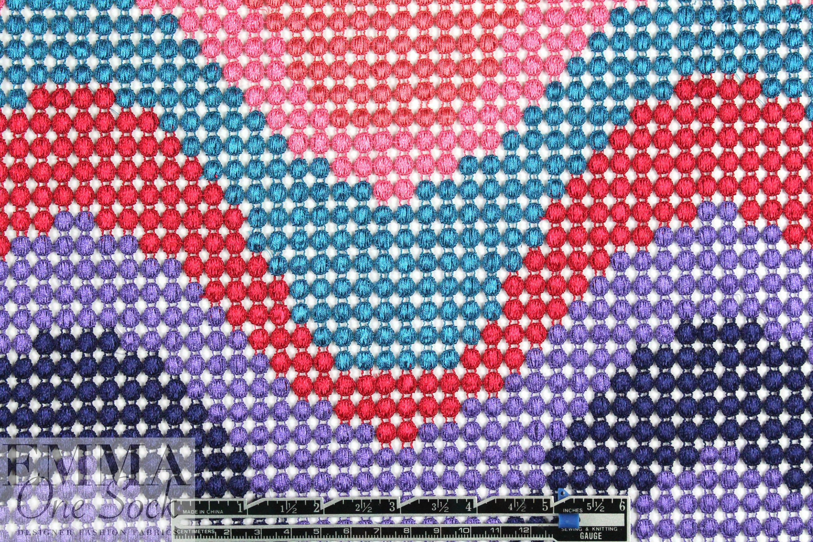 From a very very famous designer, this guipure lace wide trim has a retro "mod" look, with wavy bands of bead-like dots in tones of pink, coral, cherry, turquoise, teal, purple and dark navy (PANTONE 14-4336, 16-2124, 18-3633, etc.). One selvage has a beaded fringe and the fabric is meant to be used to that the fringe hangs at the hem of the garment. The other selvage has a neat band that can be sewn into a seam. This lace is photographed on a white background, as well as also on the dress form which shows the sheerness. The lace is substantial with a soft drape, and see-through because of the open weave. Note the narrow width. Use for any project calling for guipure lace or any type of fancy, stable lace. Lining or layering may be needed. Dry cleaning recommended.
