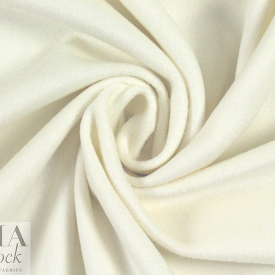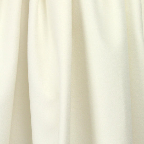 This gorgeous luxury medium-heavy weight coating fabric is a wool and viscose blend, combining wool yarns from Australian and New Zealand with viscose fibers that add durability. It feels like cashmere with a wonderfully soft hand, and the drape is soft with some body. The color is a classic winter white (PANTONE 11-4301 is close), and there's a surcharge on this color --it's more expensive to produce and the fibers are slightly thicker. It has a nap so should be cut all in the same direction. Make a gorgeous coat or jacket that you will cherish for years! Dry cleaning recommended.