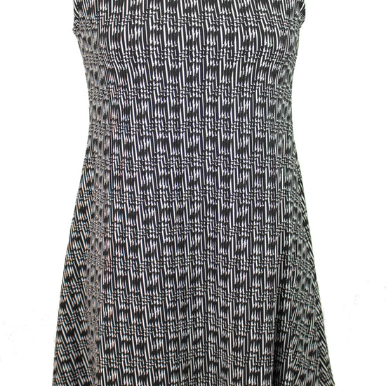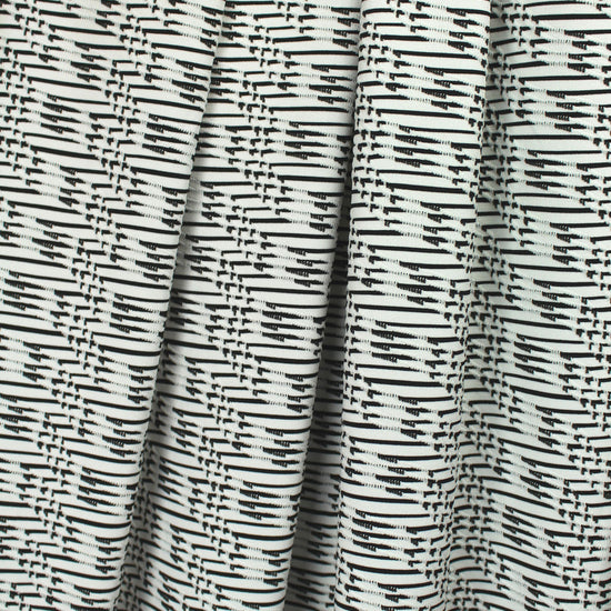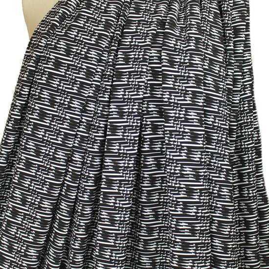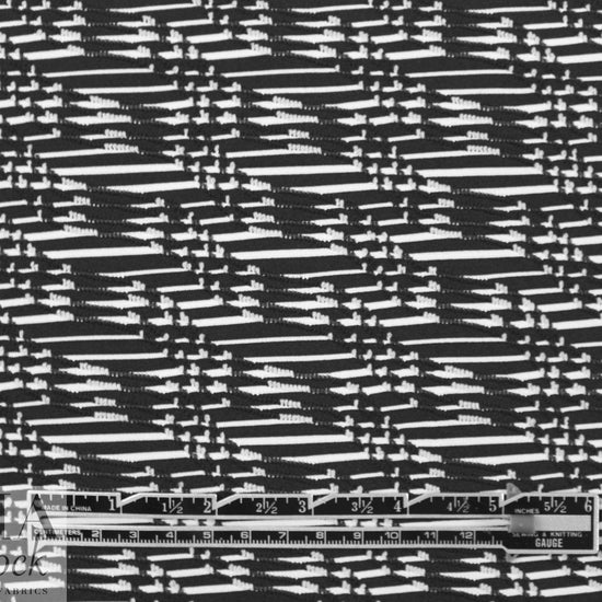 A fabulous yarn dyed, jacquard knit with a soft hand, and a very cool "twizzler" graphic design (1" repeat) in white on black. It is a light weight and opaque knit with a soft drape and about 100% stretch in both directions with great recovery. It is a versatile weight perfect for a top, tee, cardigan, pullover, tunic, leggings, etc. Manufacturer recommends hand or machine wash gentle, hang to dry.