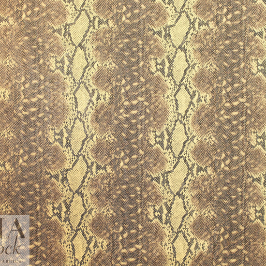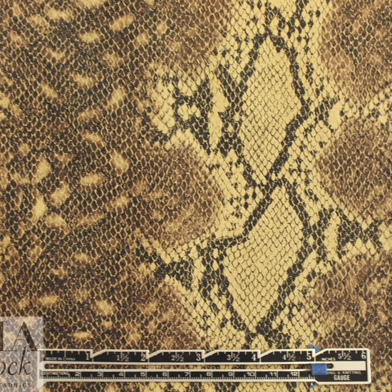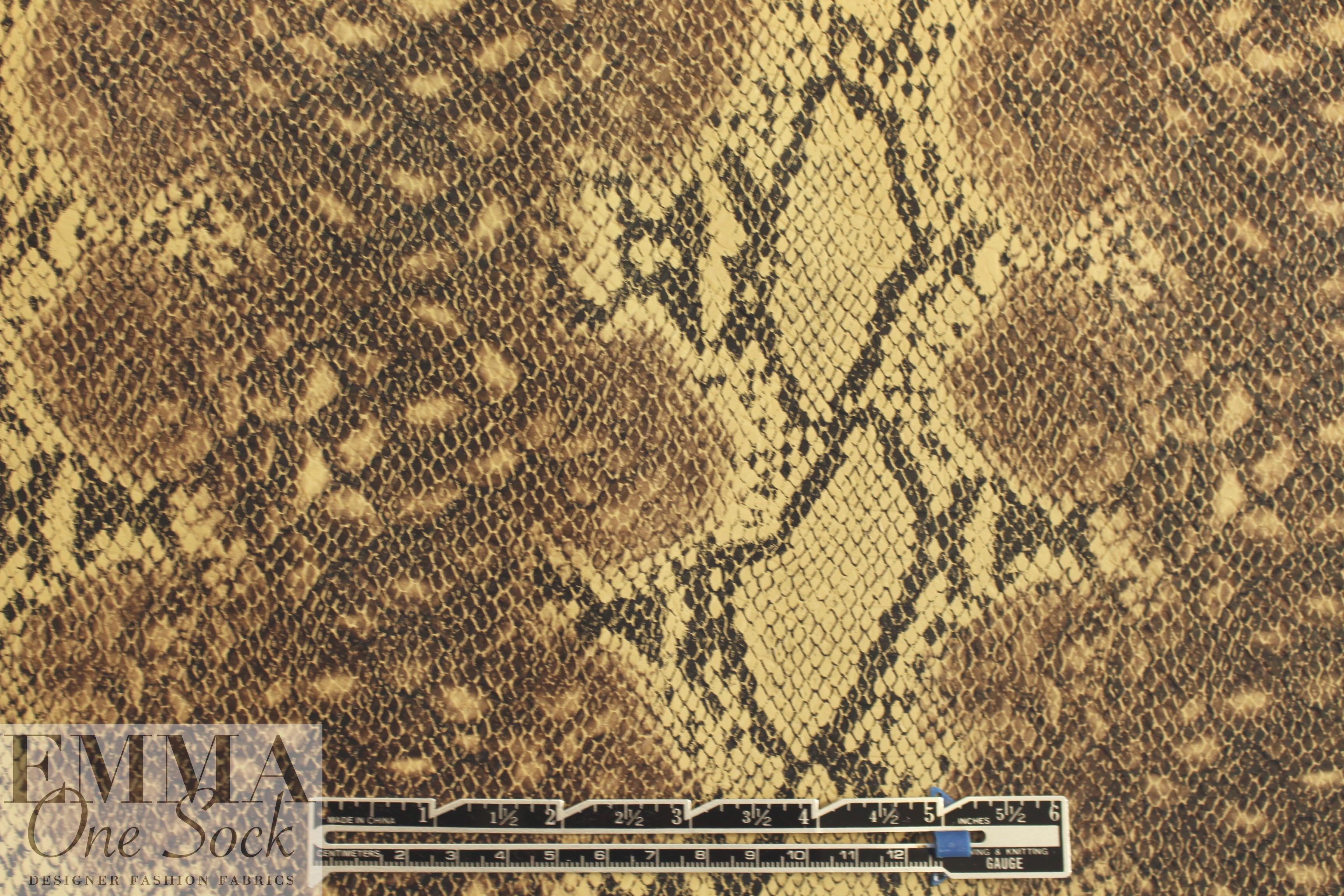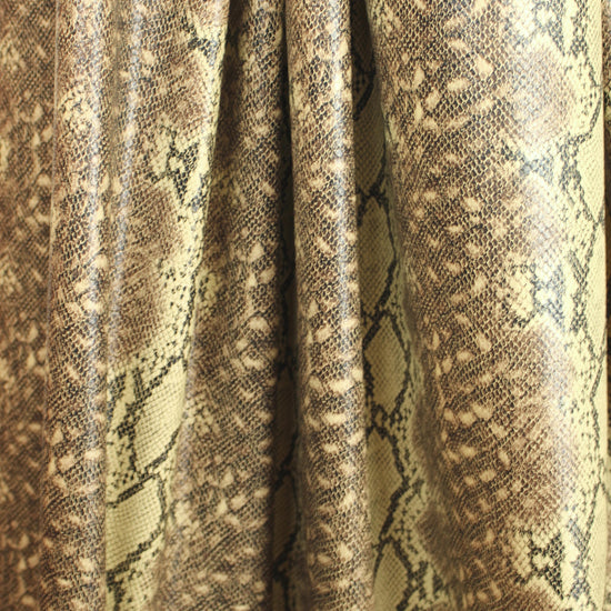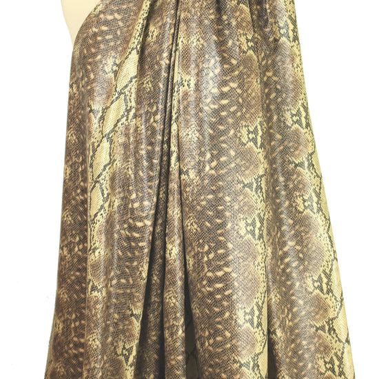 This is a fantastic printed faux (aka vegan) leather!! Beautiful quality, supple and soft with a wonderful drape, water-resistant and backed with a smooth white poly. It has a reptile print with a 7" vertical repeat, and about 15% stretch in the width only, and there is also a reptile texture embossed into the surface of the fabric to give it a more leathery look. The colors are espresso, burnished brown and taupe (PANTONE 14-1112, 19-4013, etc.). Make a fabulous coat or jacket, or perhaps skinny pants or fitted skirt. Dry cleaning recommended by the manufacturer (any dry cleaning solvent other than trichloroethylene may be safely used).