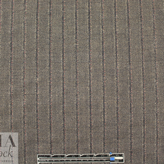 This reversible all-wool Italian suiting comes from designer Richard Ty1er, and it is a lighter suiting weight with a very soft and refined hand, and a lovely drape with just a bit of body. The stripes run vertically and are nearly an inch apart, and the earthy coloring is a mix of indigo-tinted black and sand, with a teeny touch of red on the darker side (PANTONE 19-3712, 12-0910, mixed together in various proportions). You can see the twill weave in the wider areas and the stripes are a bit fuzzy (not in texture, but in appearance) and undefined, giving this interesting fabric a unique look. Perfect for slacks, a suit, jacket, skirt, sheath dress, etc. Play with the direction of the stripes and well as the color contrasts to create many different looks. Dry cleaning recommended.
