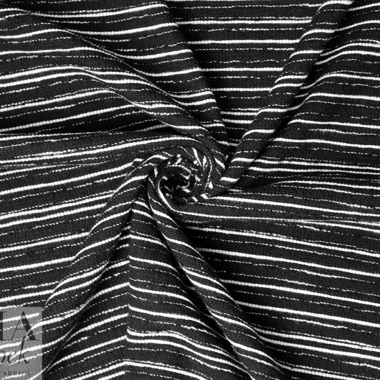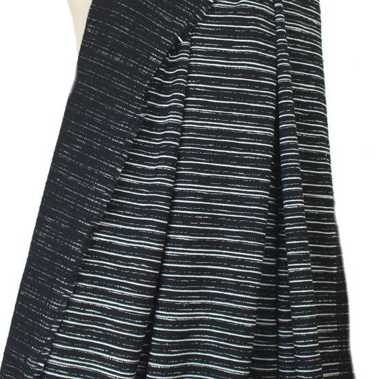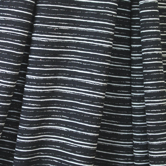 This is a fabulous yarn-dyed cotton stretch woven from a NY designer with 20% widthwise stretch. It features a black and white stripey pattern and is an opaque, textured, medium weight suiting with body in the drape, perfect for a fitted jacket, topper coat, fitted skirt, etc. Dry clean or test first if you wish to hand or machine wash. Lay flat to dry. LAST PIECE, 1.125 yds.