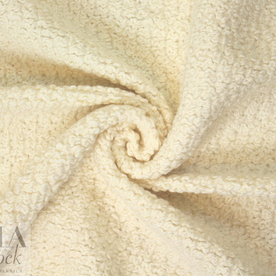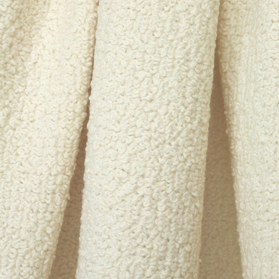 This is an exquisite Italian (Crevacuore) 98% virgin wool poodle boucle' from a very famous designer. It is a woven, super thick and highly textured on the face, more smooth on the reverse. It has lots of body in the drape but is not stiff. The texture resembles persian lamb but feels like a cozy wool. The color is a natural/ivory tone (PANTONE 11-0606 is close), and it's perfect for a winter coat or jacket. Line with charmeuse or Bemberg and enjoy your new favorite outerwear! Dry clean.
