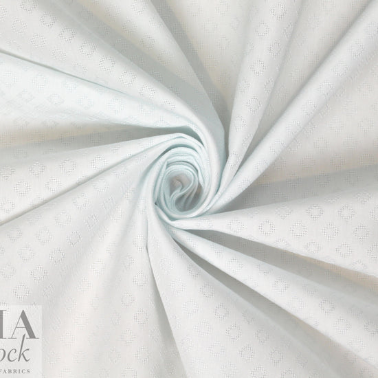 From a NY designer, this is a pale aqua (PANTONE 11-4601) cotton damask with a diamond design. It has a fresh and summery look, and is the same on both sides. Medium-light weight and semi-opaque, with a cottony crisp drape, it is perfect for a dress, tunic, beach cover-up, overshirt, etc. Dry clean or hand wash in cold water, hang to dry (but please test first). 1 yard.