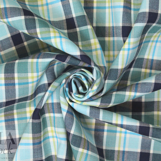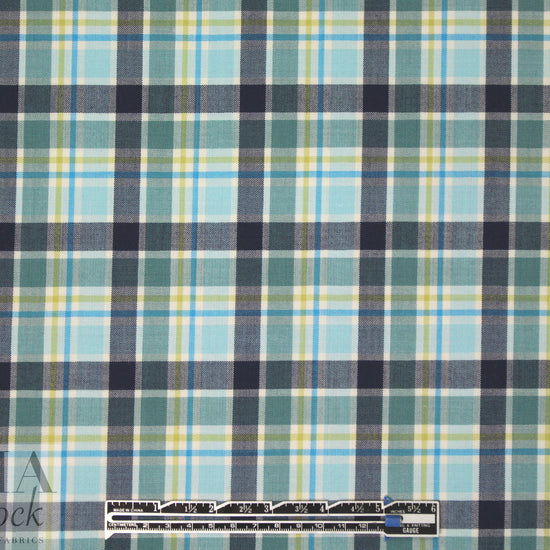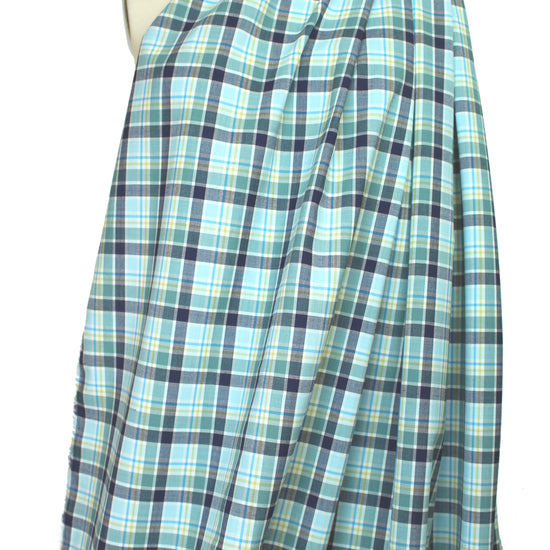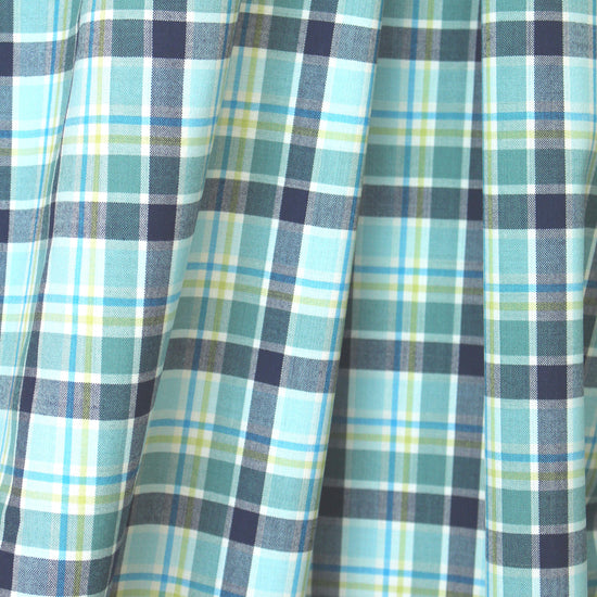 This gorgeous quality yarn-dyed, fine wool plaid woven comes from a very famous designer, and is a shirting weight with an exquisitely soft and refined hand, and a soft drape with some body. It is light weight, nearly opaque, wrinkle free, all-weather, and is the same on both sides. The colors are midnight, light blue, dusty teal aloe and white (2.5" repeat) (PANTONE 15-4421, 16-4712, 14-0636, etc.). Perfect for mens or ladies shirts, or ladies tunic, dress, skirt, etc. Dry clean or hand wash and hang to dry (please test first!). 1.66 yds.