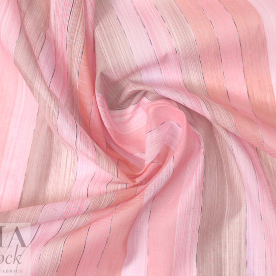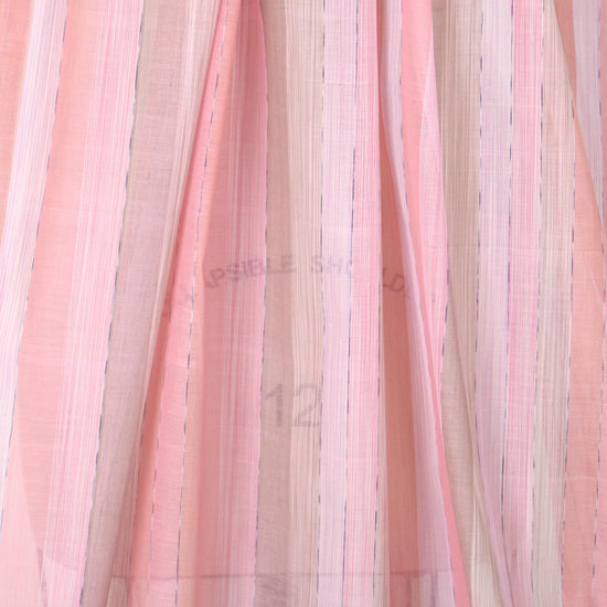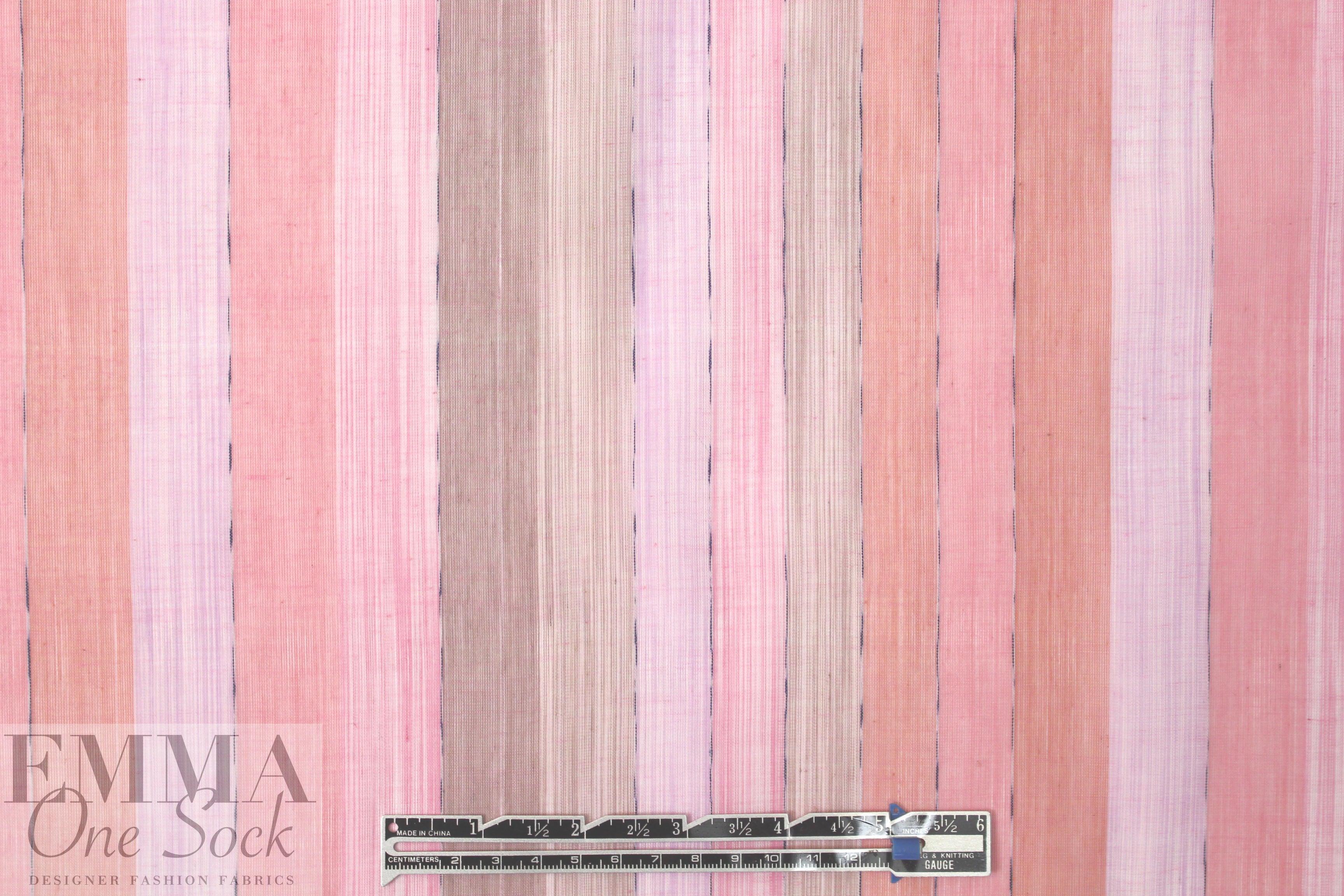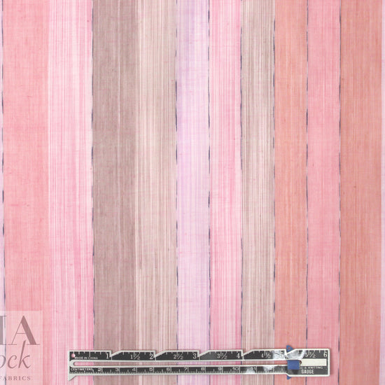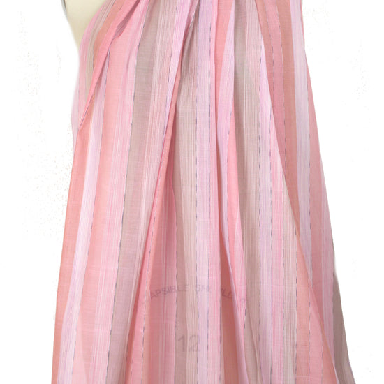 This is a lovely yarn-dyed stripe cotton/viscose organza woven from a NY designer, lightweight and sheer with crispness in the drape. It has a pattern of varied vertical stripes (9.5" horizontal repeat) in shades of coral, pink and tinted beige (PANTONE 15-1717, 15-1607, 14-2710, etc.). The stripes can be oriented widthwise or lengthwise, or mixed, for a number of fabulous looks! Try a blouse, top, overblouse, tunic, etc. Some styles will need lining or layering. Dry clean or test first if you want to try hand-washing. LAST PIECE, 1 yard.
