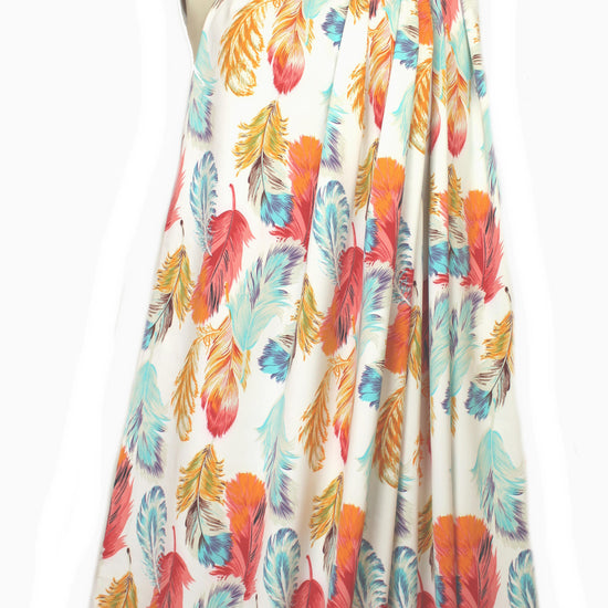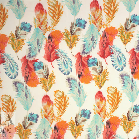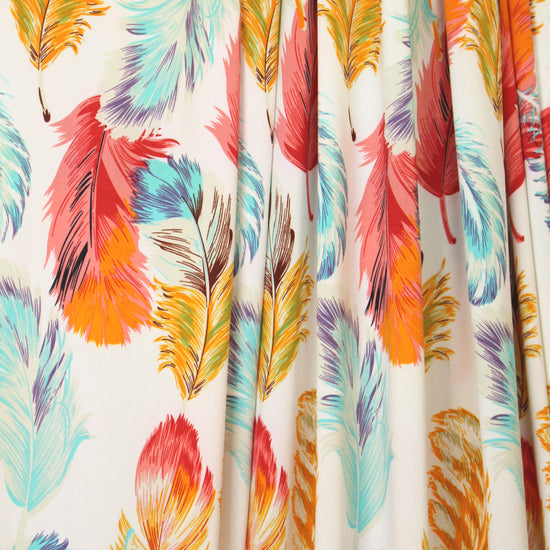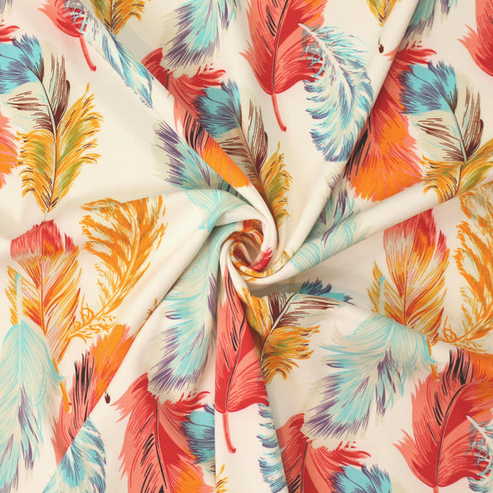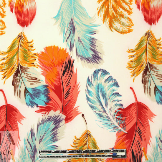 This ITY knit from a NY designer has a micro-knit construction, a smooth texture and a liquid drape. It is light weight and opaque, and the delightful feather graphic features shades of orange, sky, purple, nutmeg, black, and light khaki on a soft white ground (PANTONE 15-1164, 15-1530, 15-4825, 18-3737, etc.). It has about 40% stretch in both directions. Make a lovely top, dress or maxi dress, tunic, skirt, etc. Test first if you would like to hand or machine wash and tumble dry low. LAST PIECE, 1 yard.