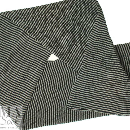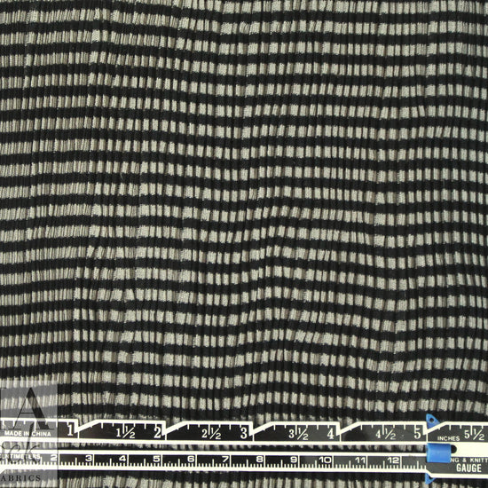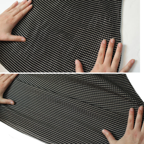 We love this! From a CA designer (Dressed to Kil1), this tight accordion pleated, striped tube knit has the most fabulous texture and great drape in a solid black. In its relaxed state it is an 10.5" tube (folded) or 21" open, and it stretches over 300% with perfect recovery. Viscose and spandex, semi-sheer, and lightweight and the colors are black and warm, light gray (PANTONE 13-0403). See the photos as a picture says 1000 words! Make a wonderful scarf, blouse, top, cool edging, etc. Dress up or down! Hand wash, lay flat to dry. 3 yds.