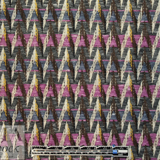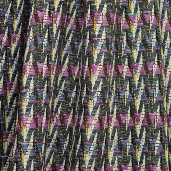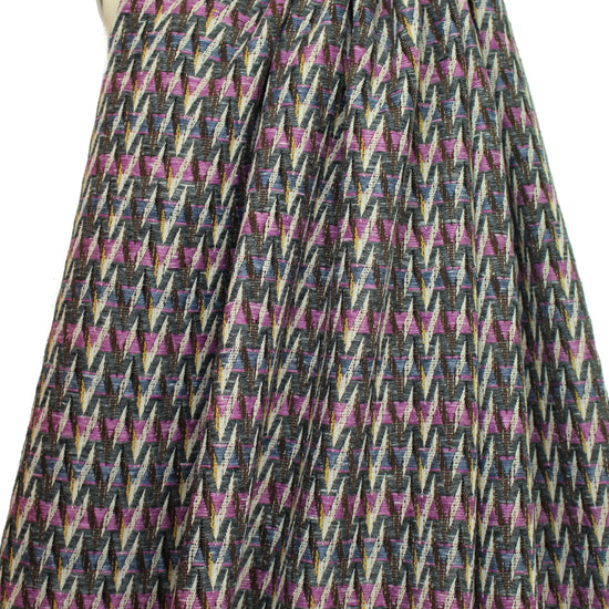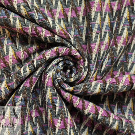 From a top Italian mill, this novelty weave coating makes an eye-catching statement! It has a textured jacquard weave in a chevron stripe pattern (3" vertical repeat), with reversed coloring on the opposite side that looks pretty much the same as the face. The yarns vary in texture and thickness, and the colors are lilac, faded denim, cream, chocolate, mustard and slate heather (PANTONE 17-3014, 17-3917, 14-0754, 19-1012, etc.). It is an opaque, medium-to-heavy weight fabric with texture, a more firm yet malleable drape and a high fashion look. Make a fabulous tailored coat or jacket. Dry cleaning recommended.
