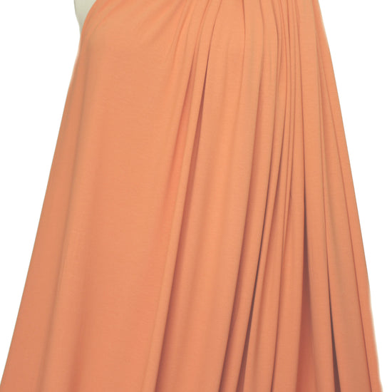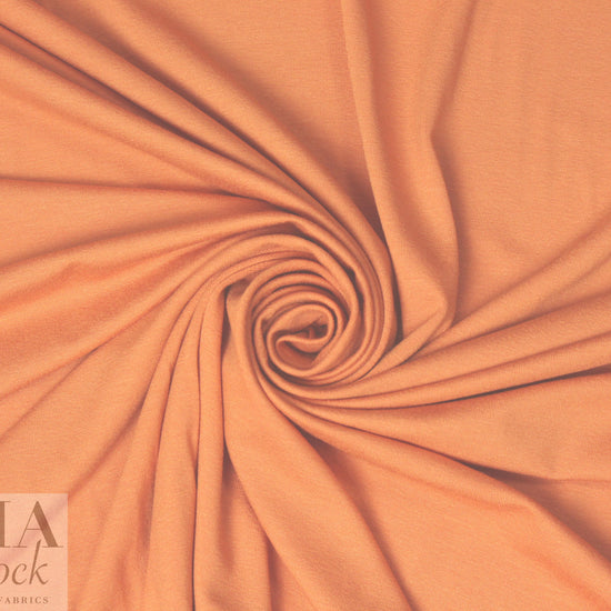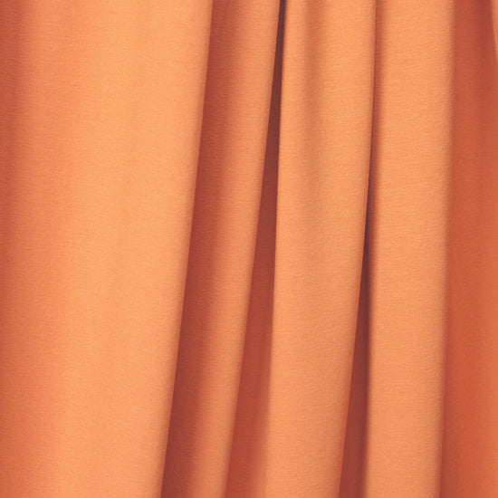 (PANTONE 16-1442) A beautiful lightweight rayon/spandex single knit jersey in a beautiful melon orange tone. Rayon/spandex is cool, comfortable, incredibly soft and drapey. This one has about 80% stretch widthwise and 40% lengthwise with great recovery, and is great for trendy tops and tees, tunics, dress, flowing skirt. Not at all sheer but it still lightweight. Machine wash gentle, hang to dry. LAST PIECE, 2 yds.
