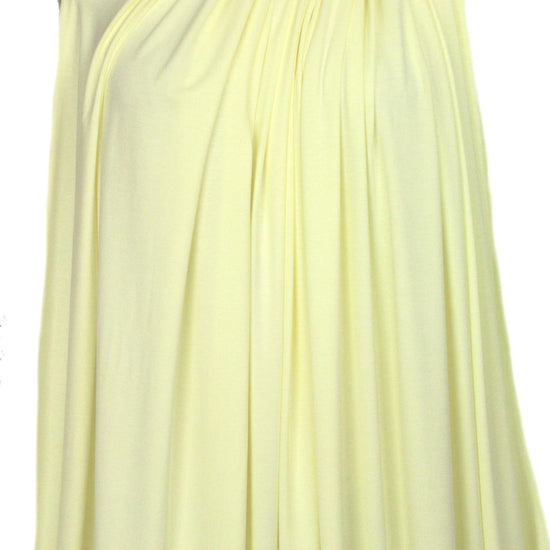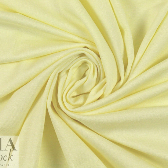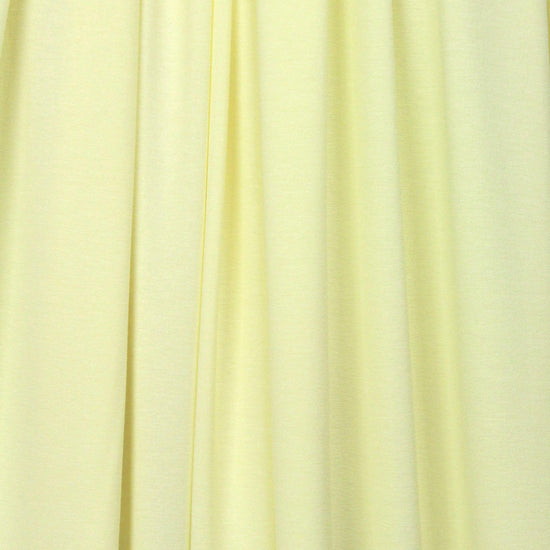 (PANTONE 11-0617) A beautiful 11 oz. rayon/lycra single knit jersey in a lovely lemon ice tone (light yellow). Rayon/lycra is cool, comfortable, incredibly soft and drapey. It has about 60% stretch in both directions with great recovery, and is great for trendy tops and tees, tunics, dress, flowing skirt. Not at all sheer but it still lightweight. Machine wash gentle, hang to dry. 1.75 yds.