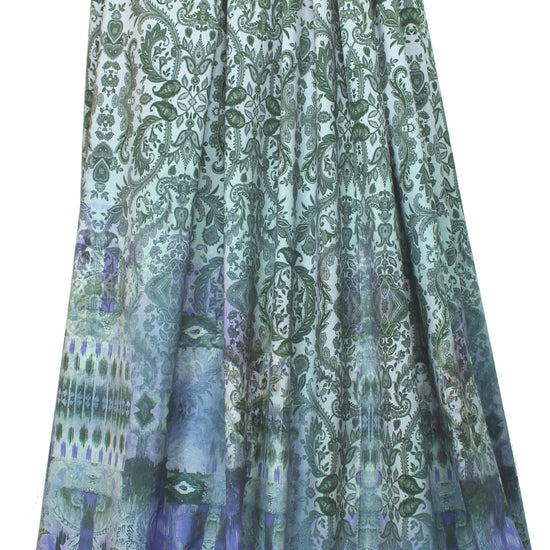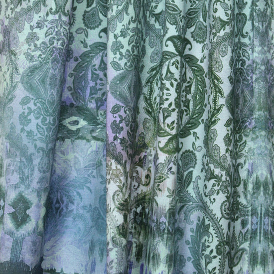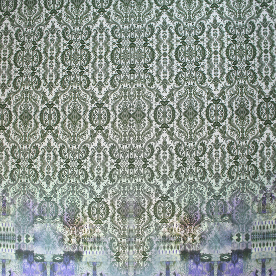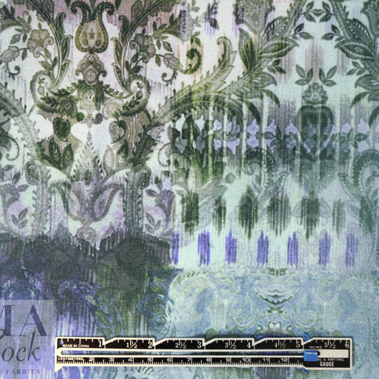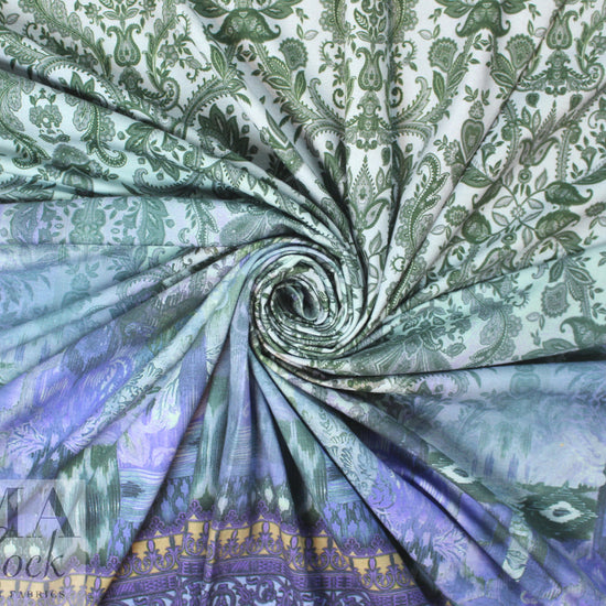 Here's another AMAZING cotton/spandex panel print imported from The Netherlands! First, the quality of the fabric is sublime, soft and substantial, with about 60% stretch in both directions. It is opaque and has a soft hand and drape with body. The stunning digital panel print is a fleur de lis design with a decorative border in shades of forest green, pale powder blue, indigo, purple, teal, camel, wisteria, etc. (PANTONE 19-0312, 14-4106, 16-3925, 15-1216, 17-4911, etc.). The first photo shows the entire panel. Make a very special tee, top, tunic, skirt, dress, etc. The manufacturer recommends hand or machine wash warm, hang to dry. Please test first. Oeko-Tex certified for non-toxic chemicals and dyes. 2.375 yds.