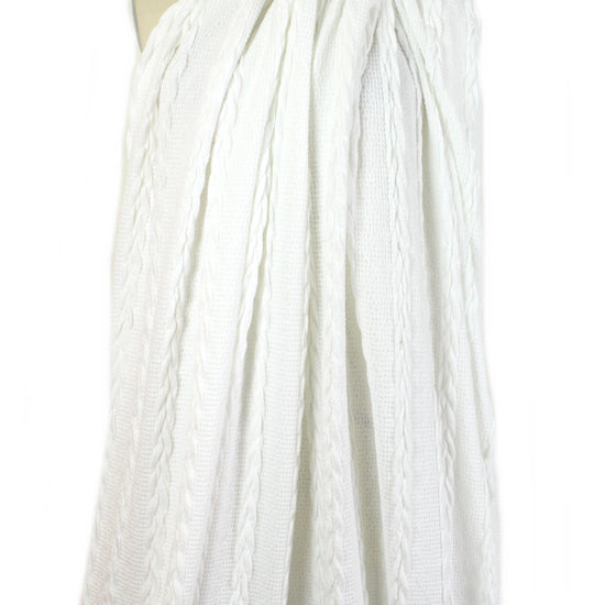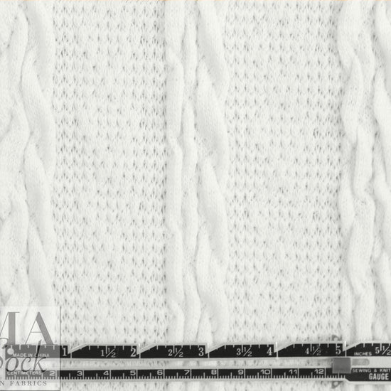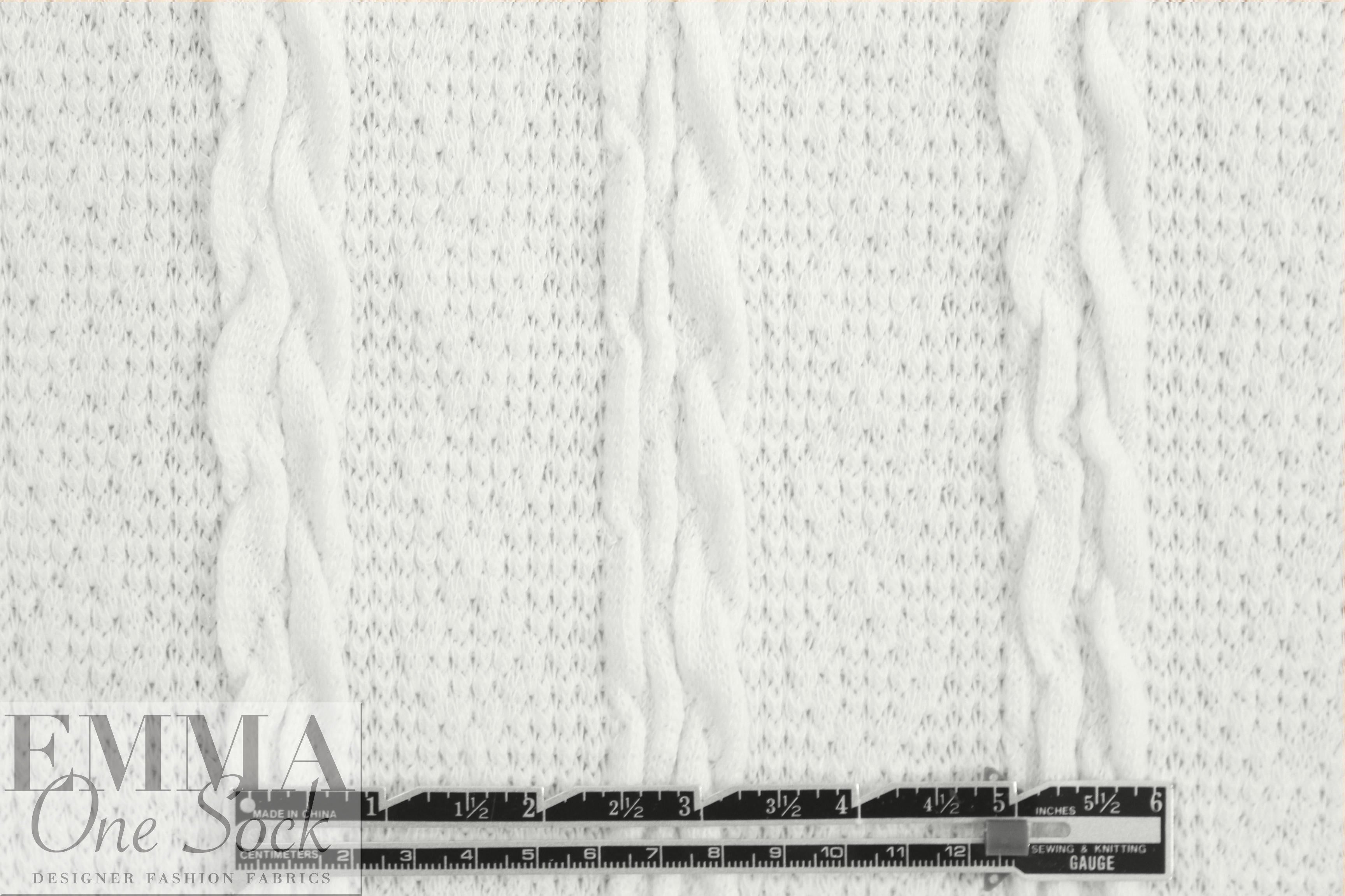 This cable sweater knit is classic, beautiful and easy care! The color is white. It is a medium-light weight sweater knit with a soft drape, and lots of dimension and texture. With about 80% widthwise stretch, it has great springback due to rows of black elastic yarns woven through the back of the knit. The cables run lengthwise and the horizontal repeat is 2.875". This beauty is perfect for cardigans, pullovers, a tunic, scarf, etc. The knit is very slightly open in some areas so some styles may need lining or layering. Machine wash in cool water, gentle cycle, lay flat to dry (please test first). 1.5 yds.
