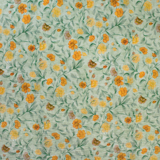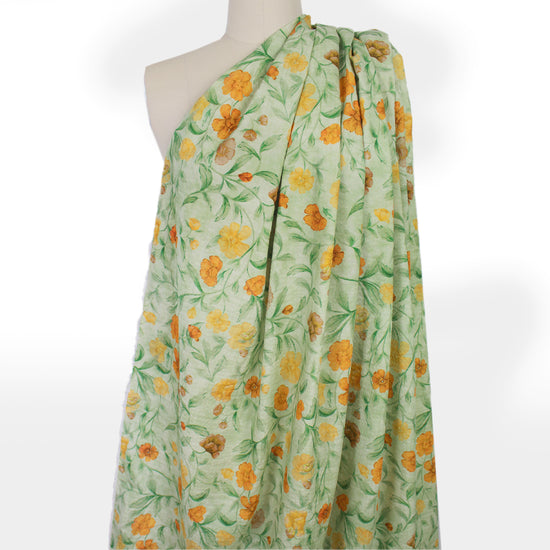 From designer deadstock and made in Italy, this is a light weight textured cotton woven, nearly opaque with a soft drape that has some cottony body and no stretch. The weave has a a seersucker texture and the lovely "cosmos flowers" design (14.75" repeat) features shades of marigold, sunny yellow, leaf green, etc. on a light sage green background (PANTONE 15-1157, 14-0754, 17-6229, 13-6007 is close etc.). Make a beautiful shirt, tunic, dress or skirt, shorts, etc. Hand wash and hang or lay flat to dry (please test first). 1.75 yds.