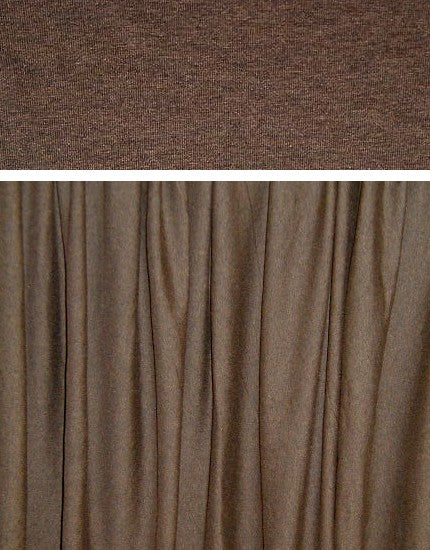 (PANTONE 19-0809 roughly) A beautiful 11 oz. rayon/spandex single knit jersey in a dark brown heather (brown with black). Rayon/spandex is cool, comfortable, incredibly soft and drapey, and the 11 oz. weight is fabulous for trendy tops and tees, yoga wear, flowy skirt or elastic waist pants, etc. It has about 60% stretch in both directions with great recovery. Machine wash gentle, hang to dry.