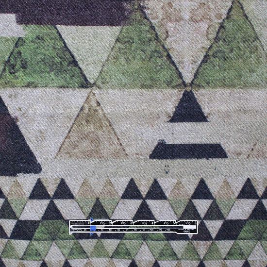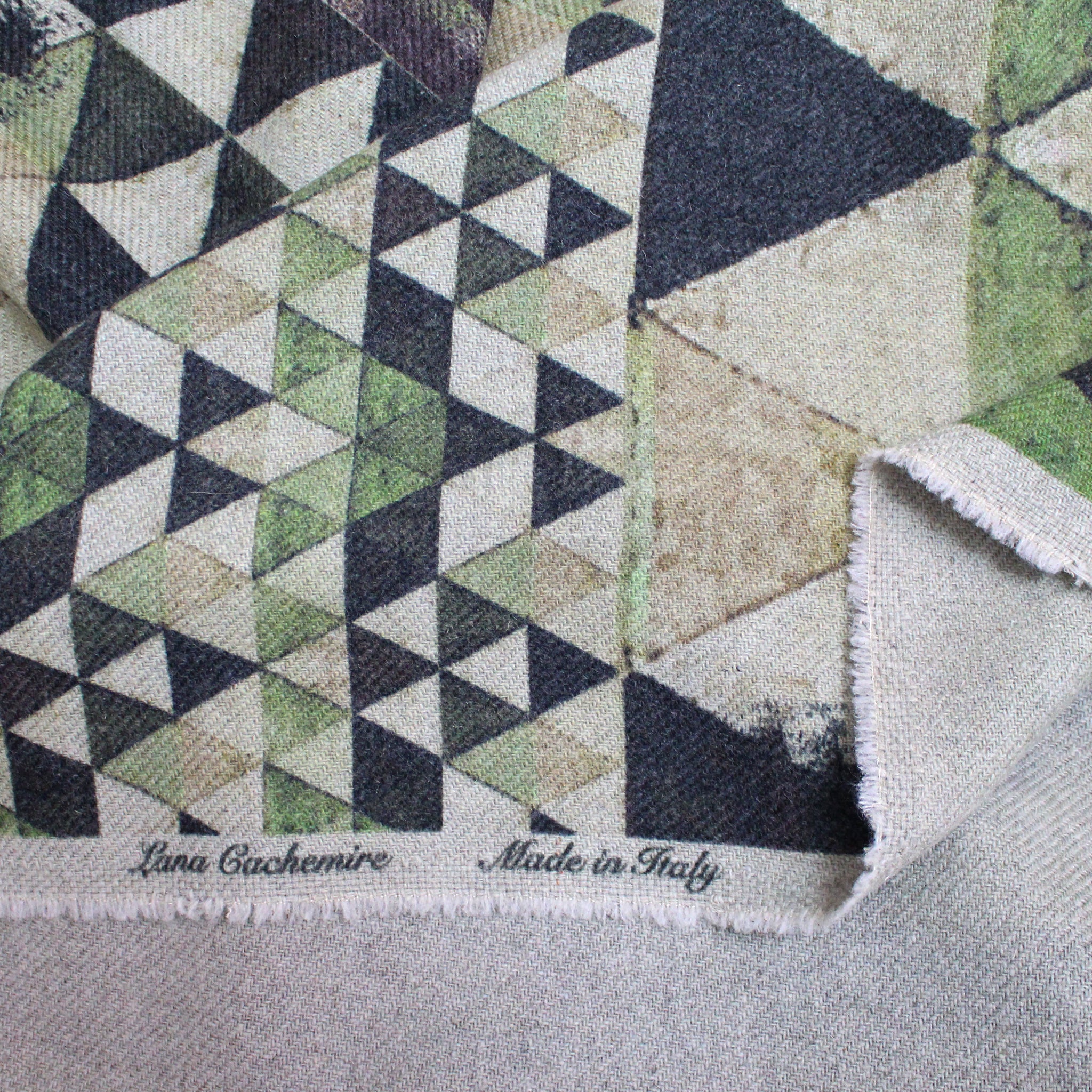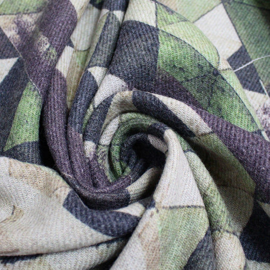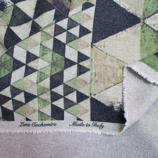 A very limited gem! From designer deadstock and made in Italy, this is an absolutely exquisite wool/cashmere blend panel print, a substantial but not at all dense woven in a medium coating weight with body and some firmness in the drape. The intriguing "summit" design has 'peaks' in multiple scales and features shades of earthy greens printed on a light sage base. Each panel is about 1.68 yards long. The cashmere content lends a slightly fuzzy texture, and it is completely opaque with no bleed-through from the print to the reverse side. Exquisite quality! Perfect for an autumnal wrap or cape, a lined or unlined coat or jacket. Dry cleaning is recommended.