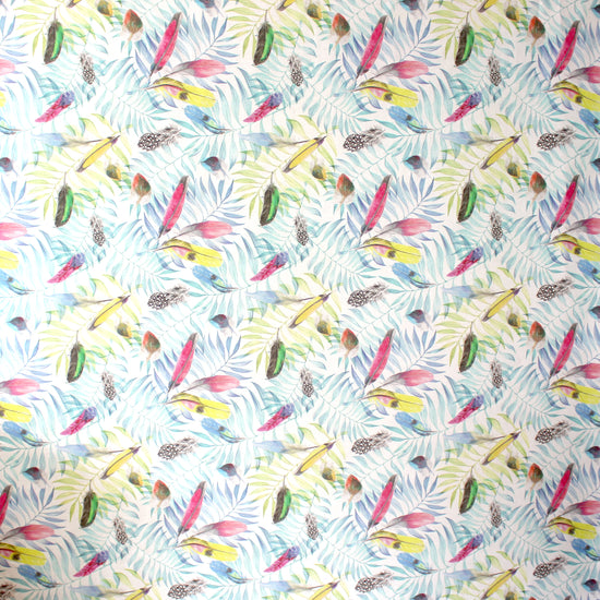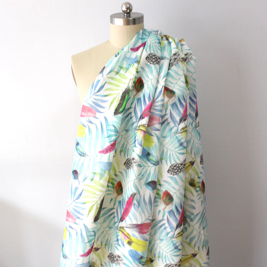 From a European mill, this is a fabulous 100% linen woven with a plain weave and vivid digital print. It is semi-opaque, a versatile light-medium weight with some crispness in the drape and no stretch. The "birds of a feather" design (13.5" repeat) features painterly tropical plants and feathers printed in aqua, teal and pink on a soft white base. Perfect for breezy separates for warmer weather: pants, tops, dresses, skirts, overshirts, etc. Hand or machine wash, hang to dry (please test first), or dry clean.