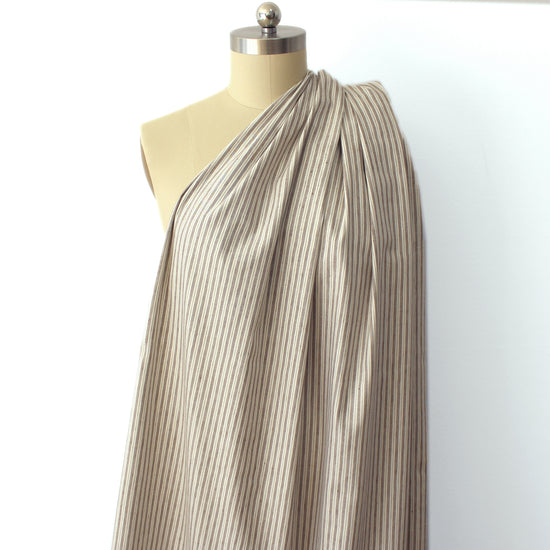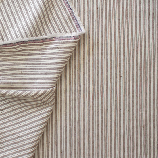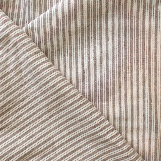 This is a lovely quality European linen blend stretch woven, a dress weight that is opaque with a bit of crispness in the drape and 10% stretch in the width only. The varying vertical stripe design is yarn dyed (.37" repeat) and features an earthy and organic colorway of coffee and cream. Perfect for a shirt, top, tunic, dress, skirt, etc. Hand or machine wash, hang to dry or tumble low (please test first).