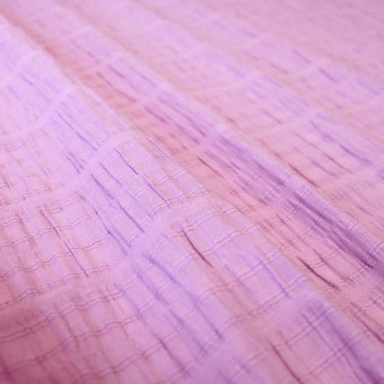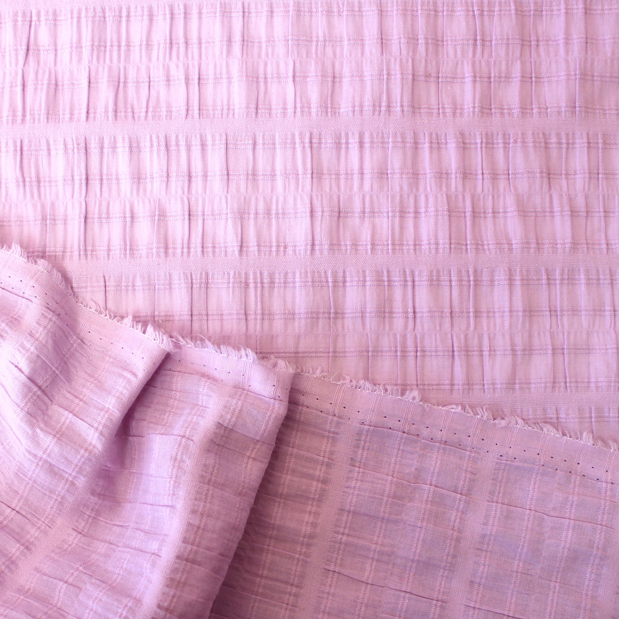 This is a beautiful quality lightweight cotton seersucker, a shirting or dress weight with a small percentage of elastic which provides additional puckering and ease. It has a series of varying woven-in stripes running widthwise with a 2.125" repeat. This fabric has a soft, dry hand with a fantastic seersucker pucker and a cottony drape. Semi-opaque with lots of textural interest! Perfect for warm weather shirts, tailored dresses, skirts, beach coverups, pants or shorts, summer suiting, babies and kids, etc. Hand or machine wash gentle, in cool water and tumble dry low. Iron on low and do not bleach (please test first).