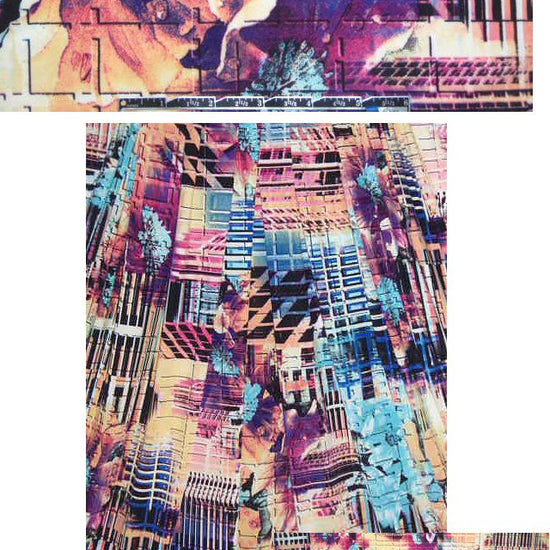 This is a poly/lycra knit with 2-way stretch (20% in the width only with perfect recovery), opaque yet very lightweight with liquid drape. The print is a fabulous digital techno-flower graphic design in tones of aqua, plum, grape, pink, butter, cobalt, tinted black, etc. (PANTONE 15-4720, 12-0824, 19-3642, 16-2120, etc.). Easy care, perfect for tops, tees, tunic, dress, maxi dress, swimwear, etc. Hand or machine wash cold, hang to dry. 1.375 yds.