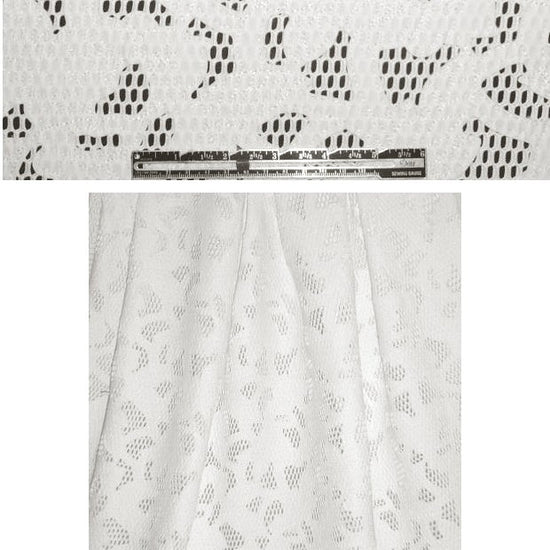 I am so intrigued by this super modern and fashion forward version of an applique' mesh fabric! The base fabric is a 2-ply "magnified" mesh fabric with a honeycomb look, a substantial yet totally open mesh (top photo is on a black background--the black is not part of the fabric). The applique cutouts create an abstracted floral silhouette and the fabric used has a leather-look for a rich, textured and "expensive" appearance. Overall the fabric has drape with body, it's medium weight but see-through where the applique doesn't cover the open mesh. The color is soft white, and it's stable yet flexible in both directions. It's such a versatile look! I could see this as an evening jacket, fitted dress, skirt or gown, but it could just as easily work as a high fashion beach cover-up. So cool. Dry clean or hand wash recommended by the manufacturer. (The mesh is 54" wide, but the applique area covers 49+".)