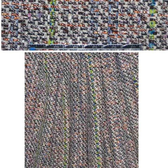 A stunning fancy wool blend basketweave boucle' made for Chane1, just in with a new shipment from Italy. It has a mix of thicker and thinner textured yarns in a gorgeous blend of winter white, espresso, copper metallic, and touches of silvery blue, sea foam, lime, lilac, etc. (PANTONE 16-1332, 13-0442, 15-3207, etc.). Although it has a more "rustic" look, it's very refined (not itchy), and both sides look the same. Medium weight suiting with body to the drape. Make a beautiful French tweed jacket, suit, skirt, lighter weight coat, etc. Dry cleaning recommended.