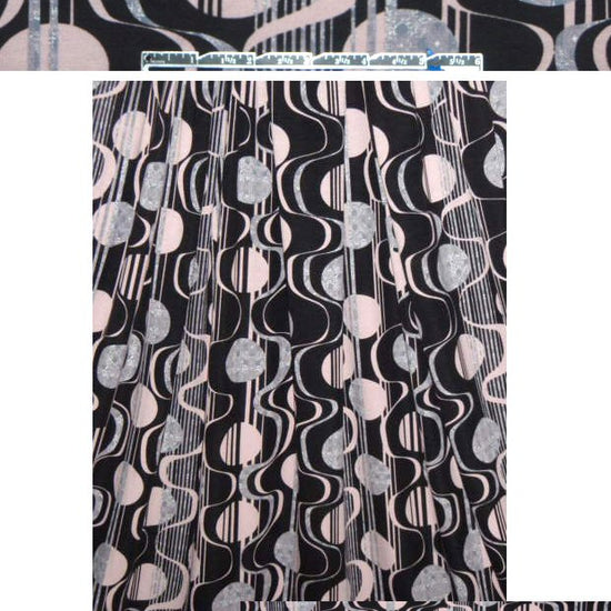From a shipment that just arrived from Italy, this is a fabulous rayon/lycra 4-way stretch knit, lightweight yet opaque, with lovely drape. The print is a fabulous serpentine graphic design in tones of dusty pink, dusty lavender and black (PANTONE 14-1905, 17-3810, etc.). 35% stretch in the width, 25% in the length, with great recovery. Great for tees, tops, tunics, dresses, etc. Beautiful quality! Test first if you would like to wash at home.