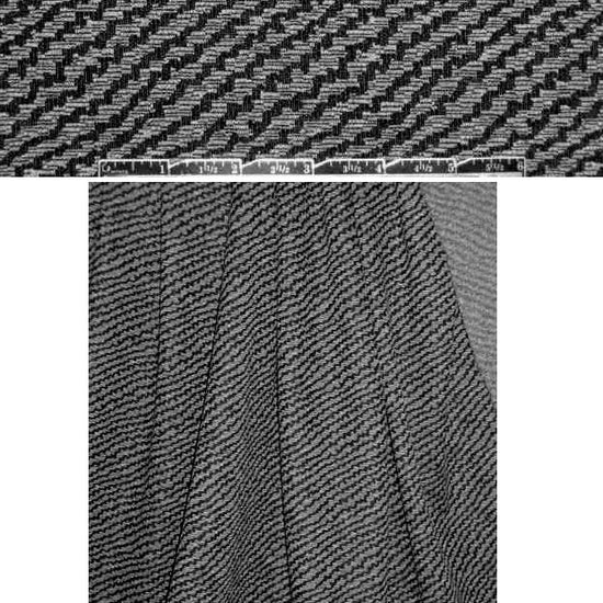 This fantastic yarn-dyed novelty doubleknit from J'Envie has a diagonal stripe design on the face in black and very light gray, while the opposite side is a salt and pepper tweed. It's a medium-weight doubleknit, opaque with body in the drape, and has about 20% widthwise and 15% lengthwise stretch, but is quite stable. Use for any project for which you would use a doubleknit weight fabric, and play with the direction of the stripes to create a chevron design. It would work very well, for instance, in a colorblocked dress, the stripes mirroring each other in opposing panels and paired with solid black. Test first if you wish to hand or machine wash in cold water, hang or lay flat to dry. 1.33 yds.