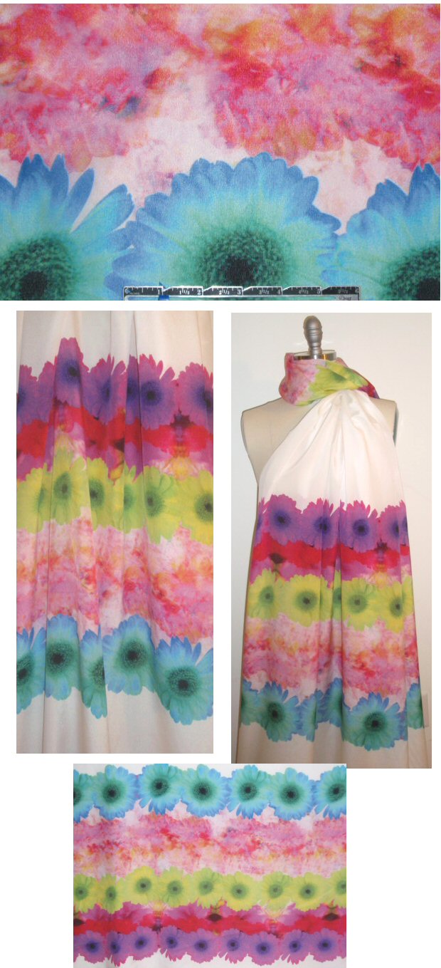 An amazing print! This beautiful quality Italian silk crepe de chine has a soft drape and is semi-opaque with a very slight sheen. The phenomenal print features photorealistic, colorized daisies in garland formation, surrounded by a soft white border on both sides. The colors include shades of aqua, pink, periwinkle, lemon-lime, red, violet, etc. (PANTONE 17-3020, 12-0633, 19-1760, 16-4132, etc.). Perfect for a blouse, top, tunic, skirt, dress, etc. Some styles may need lining or layering. Dry clean or test first if you would like to try hand washing.