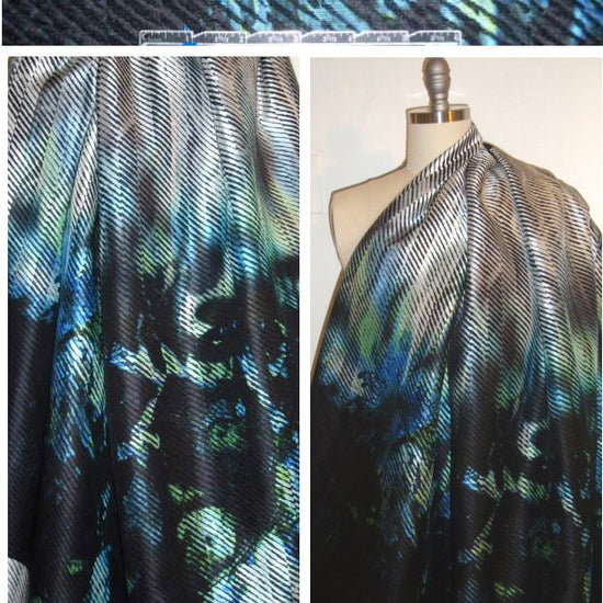 This is a striking panel print from Italy, a cotton blend jacquard with a black and pearly white diagonal pattern (yarn-dyed, not printed). It is a medium suiting weight with body in the drape, and is overprinted with a techno-floral design in tones of royal blue and lime (PANTONE 19-4037, 15-0146, etc.). Make a fabulous jacket, evening coat, pouffy skirt, fitted sheath dress, vest, etc. Dry cleaning recommended. LAST PIECE, 2 panels.