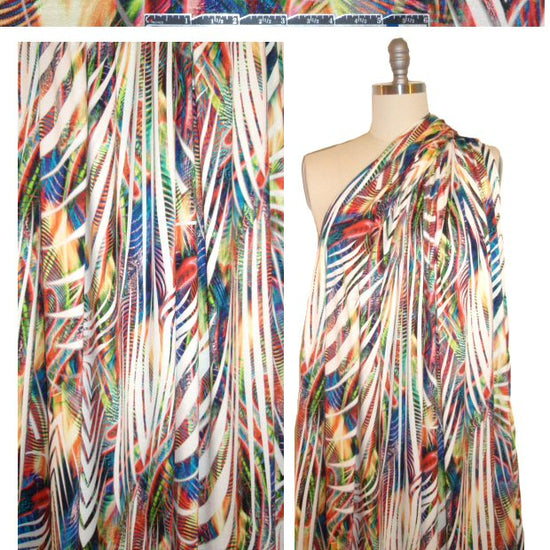 This is a fabulous "streaky psychedelic" abstract print (31" repeat) made in Italy, a beautiful quality 4-way stretch lightweight knit with 70% horizontal, 50% vertical stretch. Colors include turquoise, red-orange, lime, purple, navy, soft white, etc. (PANTONE 16-1450, 16-4725, 15-0146, 19-3737, 18-4140, etc.). It is a very soft and lightweight jersey with a dry hand, opaque and perfect for tees, tops, tunics, twin sets, etc. Please test first before machine washing.
