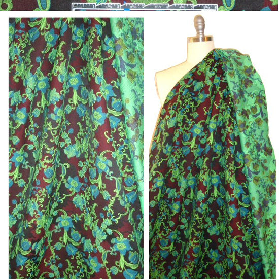 From J. Crew, this is a beautiful stretch jacquard brocade with a slightly textured lyrical floral design (woven-in, not printed, with a 16" repeat), in shades of port (deep reddish brown), lime, turquoise and black (PANTONE 19-1525, 15-0146, 17-4427). It is a tightly-woven and very refined suiting weight with body in the drape and about 10% widthwise stretch. It would be perfect for a sheath dress, fitted skirt, jacket, topper coat, vest, skinny pants, etc. Dry clean only.
