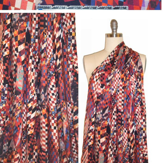 From a new shipment that just arrived from France, this is a fabulous rayon/lycra 4-way stretch knit, lightweight yet opaque, with lovely drape. The digital 'checkered past' print has a fabulous design with a 24.5" repeat. The many colors include spicy orange and red tone, denimy blues, citrine, sand, indigo, midnight, etc. (PANTONE 19-1663, 17-1444, 15-1058, 18-4027, etc.). 50% stretch in the width, 30% in the length, with great recovery. Great for tees, tops, tunics, dresses, etc. Beautiful quality! Test first if you would like to hand or machine wash, and hang to dry. 1.125 yds.