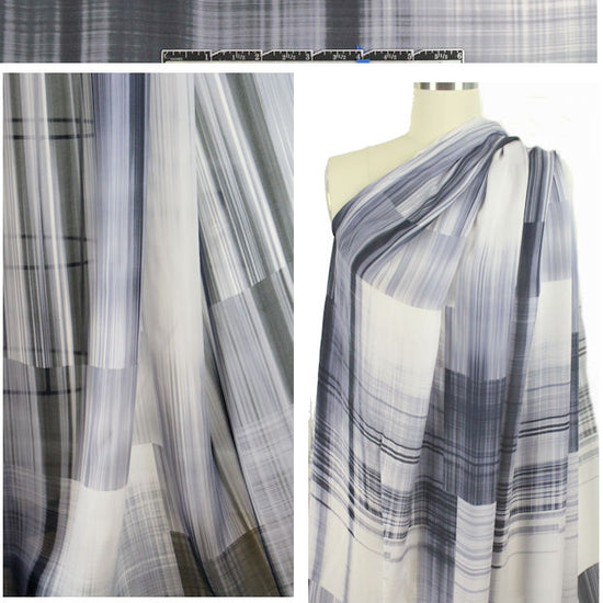 This is a lovely silk chiffon from a NY designer, very lightweight and sheer with a floaty drape and a smooth texture. The print is an edgy techno-graphic in newsprinty gray tones (38.6" repeat). Perfect for a scarf, or as an overlay for a blouse, top or tunic, etc. Some styles will need lining or layering. Test first if you wish to hand wash, or dry clean.