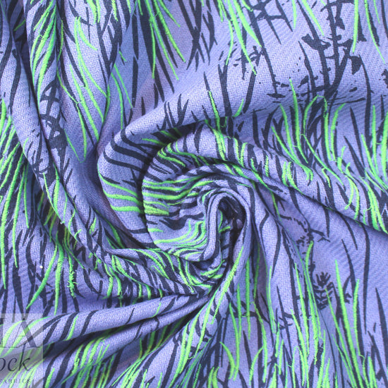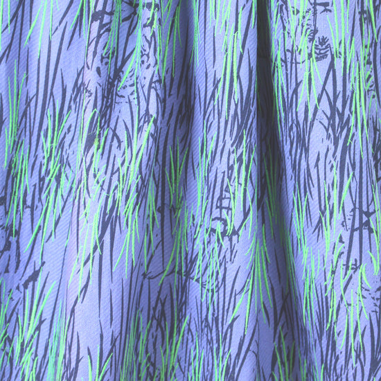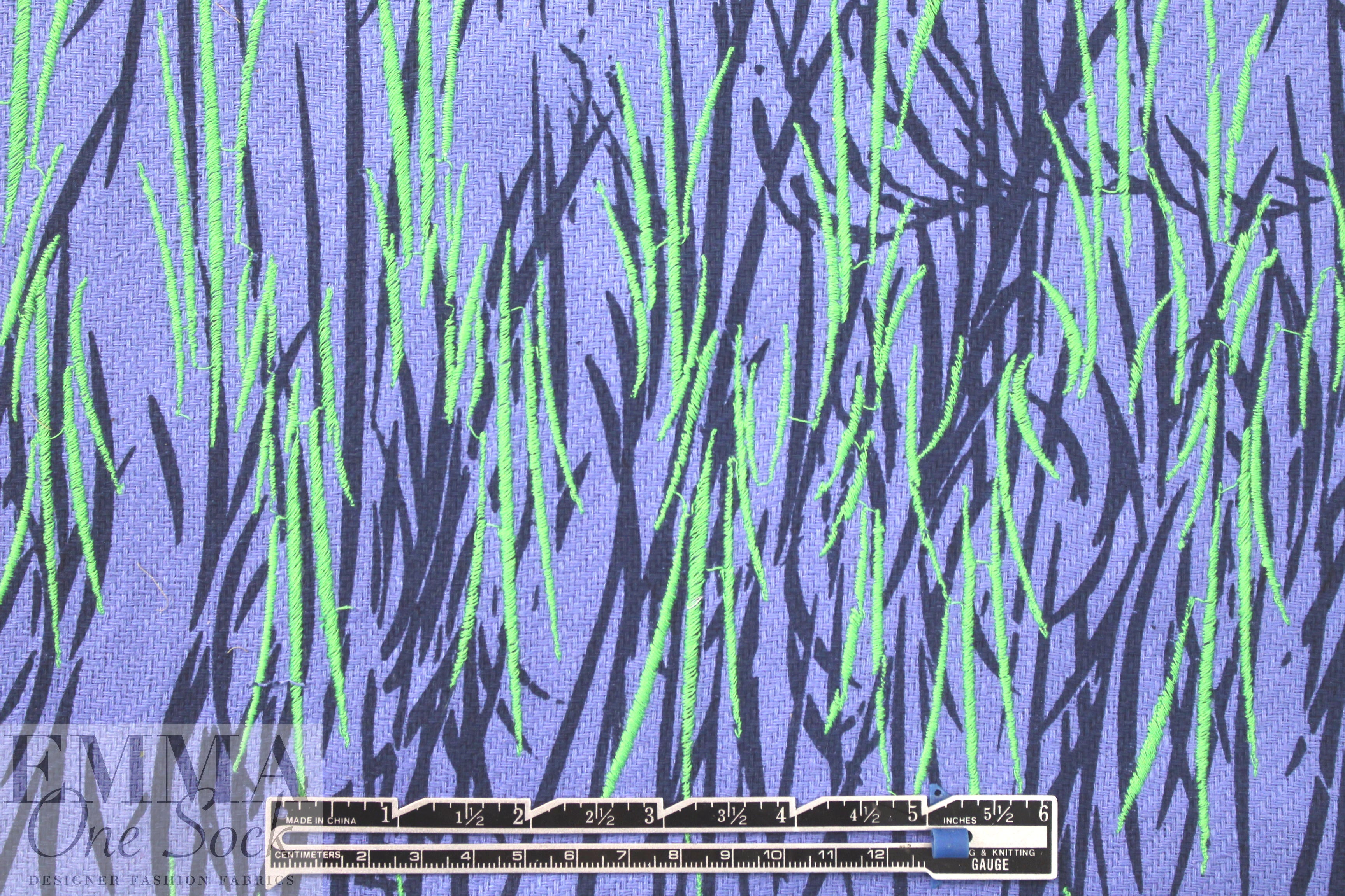From a NY designer, this wonderful printed and embroidered raw silk woven is medium weight and opaque with body in the drape. The base fabric is a beautiful wisteria, with a dark navy print (the print has a 17.5" repeat) and bright spearmint embroidery (PANTONE 17-3932, 19-4019, 14-6340). It is a perfect choice for a jacket, topper coat, skirt, etc. Dry clean, or test first if you wish to hand wash and hang to dry.