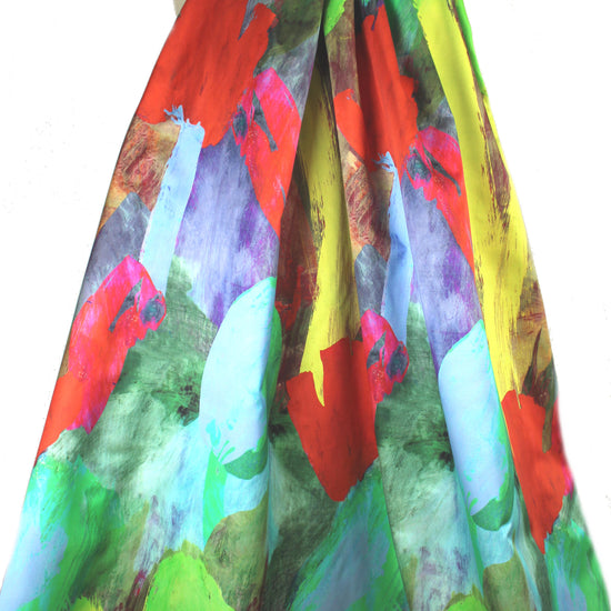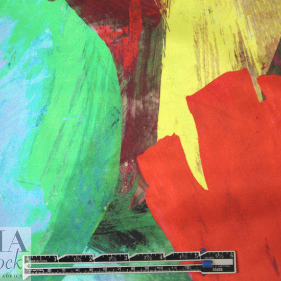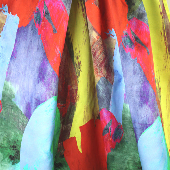 From Mi11y, this is a very special cotton sateen fabric! The print is so vivid that it appears to painted on the fabric. The base fabric is a gorgeous quality, opaque dressweight woven with a satin finish, smooth and tightly woven with a crisp, cottony drape. And the print is a stunning painterly abstract (70" repeat) with large tulip-like shapes and a super vivid coloring that includes mixed shades of red, lime, sky blue, lemon, brick, periwinkle, etc... (PANTONE 17-1562, 15-6340, 15-0545, 12-0740, 14-4214, etc.). Perfect for a tailored dress, structured skirt, jacket or topper coat, etc. Or, it could be hung as a piece of art! Amazing fabric. Dry clean or test first if you wish to hand wash and hang to dry. 1.5 yds.