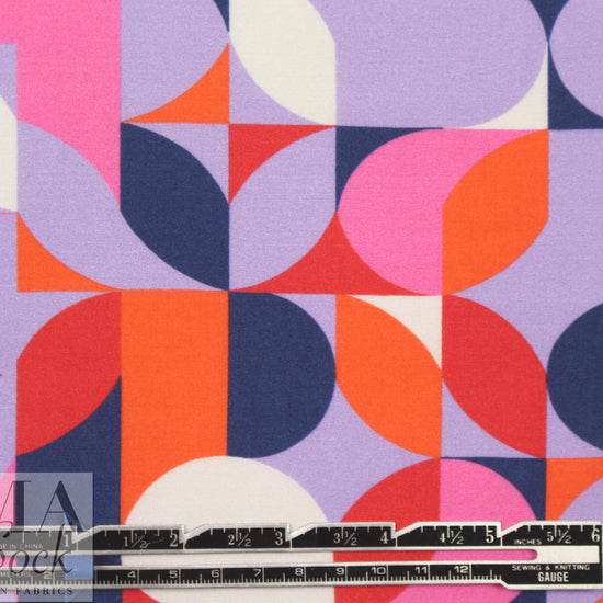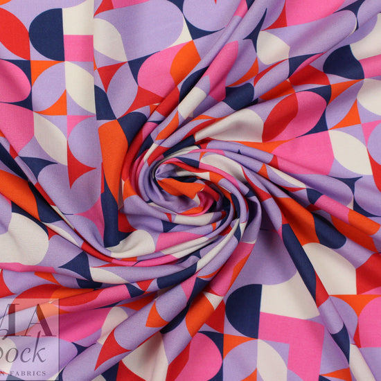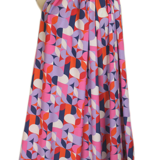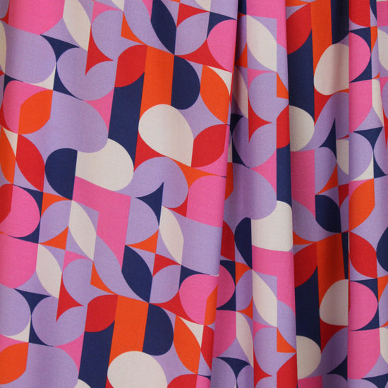 This just in with a shipment from Italian mills! It is a lovely Italian viscose (rayon) woven, lightweight yet nearly opaque, drapey and soft. The wonderful "contempo" graphic print (8" repeat) features shades of red, tangerine, pink, lavender, navy and cream (PANTONE 18-1763, 17-1462, 14-3812, 15-2214, etc.). It is perfect for a pretty shirt or blouse, top, tunic, dress or skirt, etc. Some styles may need lining. Dry clean or test first if you wish to try hand or machine wash gentle, and hang to dry. END OF ROLL, 1.5 yds.