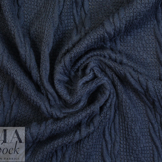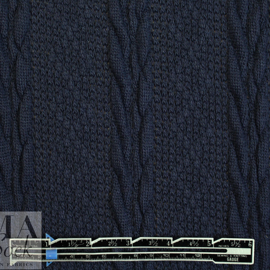 This cable sweater knit is classic, beautiful and easy care! The color is india ink a dark marine blue (PANTONE 19-4019). It is a medium-light weight sweater knit with a soft drape, and lots of dimension and texture. With about 80% widthwise stretch, it has great springback due to rows of black elastic yarns woven through the back of the knit. The cables run lengthwise and the horizontal repeat is 2.875". This beauty is perfect for cardigans, pullovers, a tunic, scarf, etc. The knit is very slightly open in some areas so some styles may need lining or layering. Machine wash in cool water, gentle cycle, lay flat to dry (please test first). .625 yds.