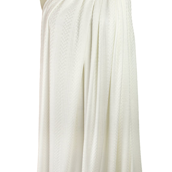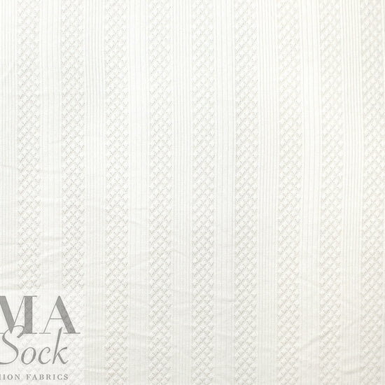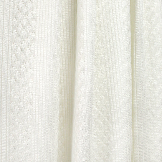 This is a wonderful rayon blend sweater knit with a classic pointelle design of alternating rib and diamond stripes on one side and a plain knit stitch on the other. The 'diamonds and bands' pattern has a horizontal repeat (pattern strips run vertically, just to be clear) of about 4.5", and the color is a light cream (PANTONE 11-0602 is close). It is a light sweater weight and nearly opaque with lovely drape and about 50% widthwise stretch. It is perfect for a cardigan, top, tunic, shrug, etc. Hand wash and lay flat to dry, or dry clean. 2.5 yds.