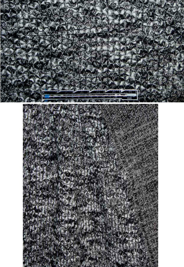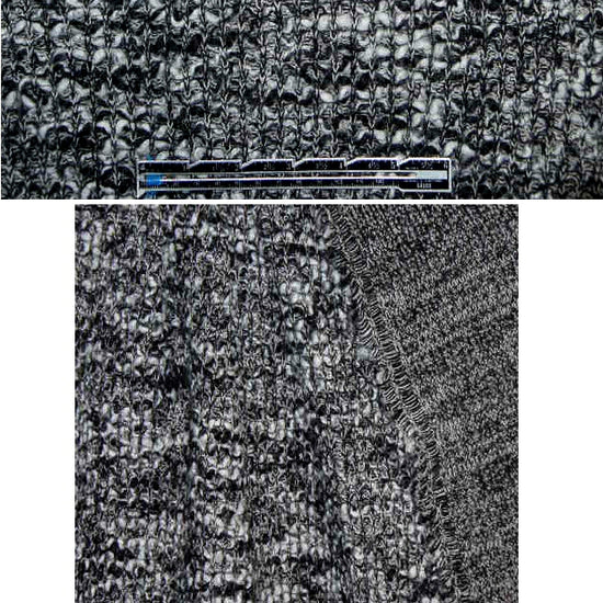 From a NY supplier (I'm not sure where it was made, but probably Italy), this beautiful wool tweed sweater knit is a chunky weight that starts with a salt and pepper tweed (seen on back) through which thicker boucle-ish yarns are woven. Colors are black and winter white, and it's fairly stable in both directions. Make a great indoor or outdoor sweater-jacket, coat, cape, or a chunky pullover, tunic or dress to wear with leggings and boots. Dry clean or treat as you would any fine sweater knit. CUTTING ERROR, 1.45 yds.