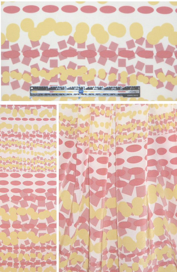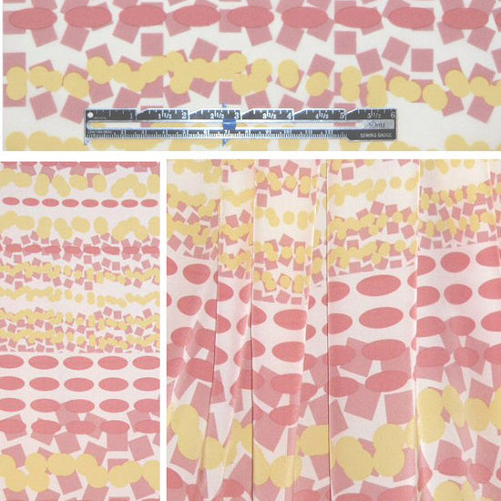 A beautiful silk crepe de chine fabric from C0rey Lynn Calter, drapey with body, and lightweight but semi-opaque, with a slight and lovely sheen. It has a lovely repeating (24" repeat) graphic in shades of dusty mauve, lemon, cream and pale gray (PANTONE 16-1707, 16-1617, 12-0736, 14-4103). Perfect for a blouse, dress, tunic, top, etc. Some styles may need lining. Dry clean, or test first if you wish to try hand-washing. LAST PIECE, 1.75 yds.