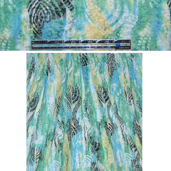 This comes from a NY designer, a cotton/poly lightweight burnout knit with a soft texture and drape and a mottled design, over-printed with a wonderful batiky abstract in tones of sky, lemon, green and white (PANTONE 16-4427, 16-5942, 12-0752, etc.). Perfect for casual tees, tops, tunics, etc. Semi-sheer because of the burnout areas, so you'd probably want to line a dress or skirt. If you wish to try washing at home please test first. 2 yds.