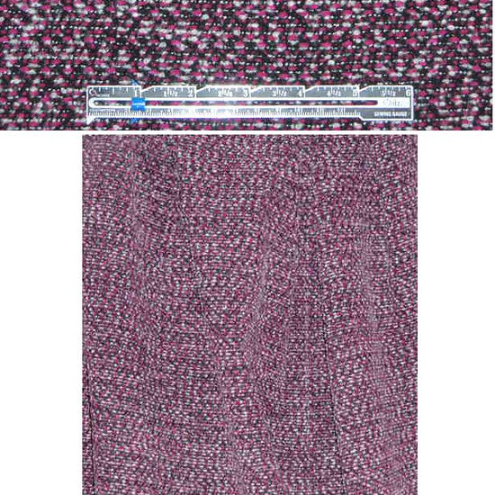 This is a beautiful tweedy suiting from Italy, textured and more tightly woven with nubby yarns in fuschia, black and pale gray (PANTONE 19-2630, 14-4203, etc.). It's a medium-weight suiting with a more firm drape and body and is perfect for a jacket or coat. Dry cleaning recommended. 1.75 yds.