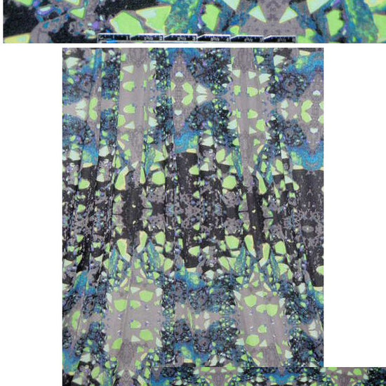 From a NY designer, this is a wonderful (and wide!) silk jersey print, lightweight but opaque with lots of drape. The print is a rorschach abstract (17" repeat) in shades of teal, lime, black, graphite and yellow (PANTONE 14-0232, 17-3802, 18-4537, etc.). It has about 2015% widthwise stretch and is a perfect choice for drapey knit tops, tees, tunics, or line with power mesh for a dress or skirt. Dry clean or test first if you wish to hand wash.