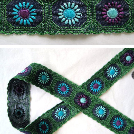 From a new group of trims just in from a very famous designer, this flower-embroidered denim trim features kelly, aqua and turquoise embroidery on a dark blue denim (PANTONE 16-6138, 16-4725, 14-4816, etc.) in a 2" wide band, a perfect finishing touch on a casual garment!