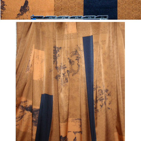This is a wonderful stretch silk charmeuse from Tahari, lightweight and opaque with a pleasing sheen and 20% widthwise stretch. The print is a very cool vintage patchwork montage (41" repeat) in tones of caramel, bronze, black, etc. (PANTONE 16-1148, 16-1432, etc.). Make a fabulous blouse, tunic, top, dress, or a luxury lining for a stretch woven jacket or coat. Dry cleaning recommended.
