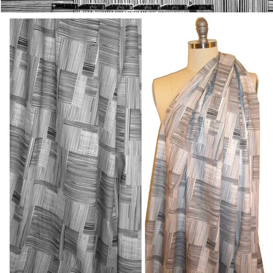 This is a fabulous cotton/lycra woven with about 15% widthwise stretch, a cottony dress/pants weight with a very dry hand and smooth surface texture. It's medium-weight, opaque, with a cottony crisp drape. Fabulous "patch hatch" graphic (the print is much more clear and sharp and wonderful in real life) in black on white. Perfect for a summery dress, skirt, capris or pants, jacket, etc. Hand or machine wash separately, cold, hang to dry. 1.33 yds.