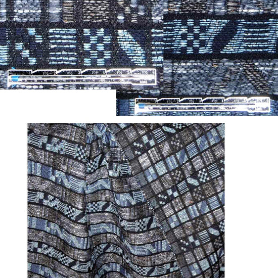 Got the last 4 yards or so of the beauty from 2012! From the Israeli-American designer Yigal Azrouel, this is a FANTASTIC coating! It's a thick fancy weave that has more of a mosaic look on one side and a more stripey look on the other. Both sides are gorgeous! The coloring has variegated denimy blue tones mixed with black in a complex and eye-catching weave. Perfect for a fall/winter jacket or coat to wear with jeans and great boots (for instance). Keep it simple and let the fabric speak! Much more fabulous in real life. Dry cleaning recommended.