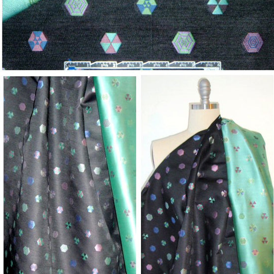 This is a beautiful quality suiting weight jacquard brocade from 0pening Ceremony, medium weight and opaque with a firmer drape and a smooth and refined weave. The "hexa-dot" graphic features mauvey pink, cadet blue, wintergreen and purple on a black background (PANTONE 16-2215, 18-4032, 14-5413, etc.). Perfect for a tailored jacket, suit, fitted skirt or dress, vest, etc. Dry clean only.